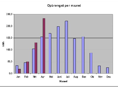 Nu de dagen weer langer worden, wordt het langzamerhand tijd om de voorlopige resultaten van het tweede jaar van onze zonnepanelen te analyseren. Met nog 8 maanden te gaan liggen we zeer op schema om onze inschatting te gaan halen. We zijn bij de aanschaf op basis van internetinformatie uitgegaan van een opbrengst van 1363 kWh per jaar. In het eerste jaar zijn we geeindigd op 1373. Dit jaar liggen we door de fantastische maand april ruim voor op schema.