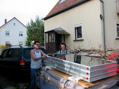 De kollektoren worden dwars over het balkon heen naar beneden gekiept en Thomas mag opvangen. Oppassen dat die dingen niet in het gat vallen. Je kunt toch wel merken dat we 35 Plus zijn... na twee kollektoren hadden we er genoeg van, pas de volgende dag werd de laatste geplaatst. Onderstaande foto is van vrijdag.