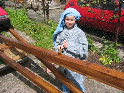 Het valt niet mee, alles moet twee maal geverfd worden, maar ja, het konijn heeft vrij. Slappie mag in de tuin rondlopen want we hebben het konijnenhok nodig als ondersteuning voor de balken.