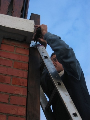 Er moeten 3 leidingen door de muur worden getrokken. Eentje voor de toevoer van koud water naar de kollektoren, eentje voor de afvoer van warm water naar de boiler en nog één voor de temperatuurvoeler. Voor de aansluiting van de zonnepanelen waren al gaten in de muur geboord bij de aanleg van de zonnepanelen. Destijds was de electricien aan de binnenkant begonnen met boren, maar het gat was onder het terras uitgekomen. Onder de houten paal moest dus nog een ingang zitten. Met wat beitelen is het gat snel gevonden zodat de eerste leiding naar binnen kan gaan.