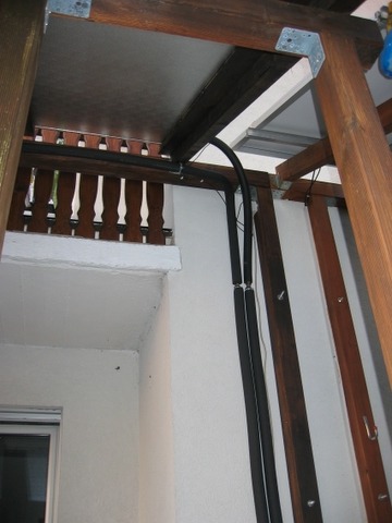 Hieronder een foto van onder het balkon. De geisoleerde leidingen lopen van boven naar beneden en gaan via de gaten door de keldermuur naar binnen.