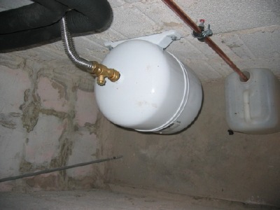 Deze foto is van boven genomen in de kelder. Het witte overdrukvat zorgt ervoor dat bij hoge temperaturen (veel zon) de druk in het systeem niet te hoog wordt. Daarnaast is ook nog een jerrycan aangesloten voor het (theoretische) geval dat het overdrukvat te klein is of niet goed funktioneert.