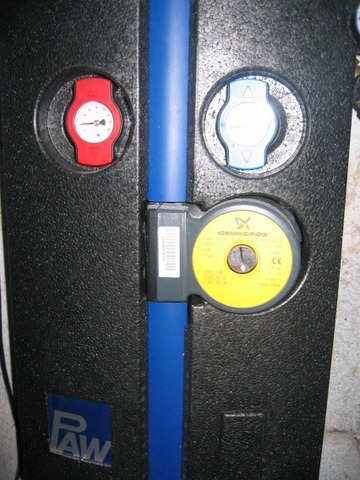 Hieronder is een foto van de circulatiepomp. Deze gaat werken op het moment dat de temperatuur van de kollektoren een paar graden hoger is dan die van de boiler.